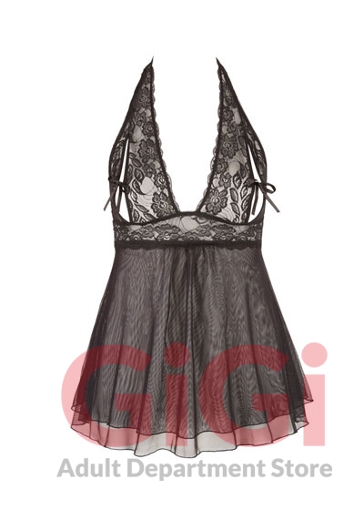 This black halterneck babydoll has a hook-fastener at the back and cheeky slits in the the cups that are only held together by small bows. The double-layered skirt part is slightly flared and covers your hips in a beautiful way. Who can resist this pretty little babydoll?