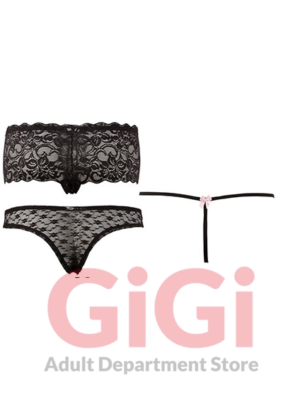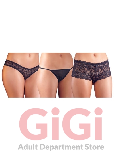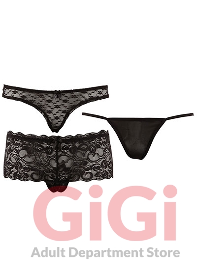 3-piece set with 1 pair of crotchless panties made out of floral lace, 1 classic string with stretchy straps and 1 pair of tiny briefs with a semi-transparent floral pattern.