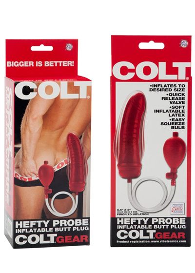 A bigger, more realistic version of the popular Colt Inflatable Butt Plug, the Hefty Probe also delivers a perfectly customizable anal experience. This latex coated, naturally curved dildo plug boasts a classic phallic shape, with a tapered design that's easy and comfortable to insert. As for the thickness of the Probe, that's entirely up to you- a classic hand pump connects to the base with a length of pliable tubing, allowing you to inflate until it's as big around as you like. Our testers found that about 25 pumps gets it to the largest point without bulging of the material, you'll want to be very careful not to over-inflate the plug. A release valve on the bulb lets you deflate the Hefty, returning it to default position. Use a great quality water or silicone based lube with this toy, aside from making your experience much more comfortable, these lubes will extend the life of your Probe.