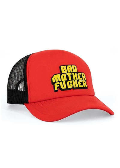 This "Bad Mother Fucker" Trucker Hat is made of polyester foam with a puffy foam-printed graphic, and features an adjustable snapback design so one size fits most.