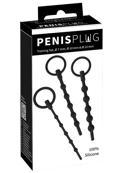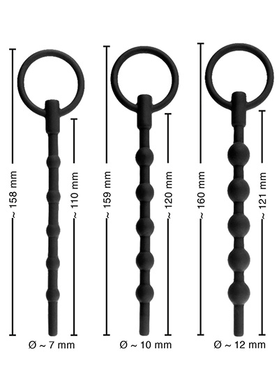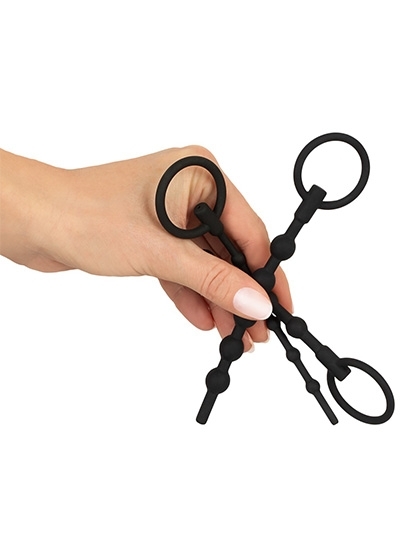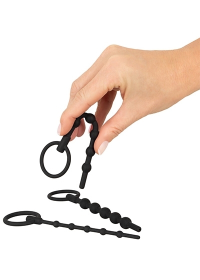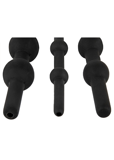 Penis plug training set with 3 different dilators. All three are made out of velvety soft silicone and they each have stimulating beads in different diameters. Each bead dilator has a rounded tip and a retraction ring for easy insertion and removal. They are also bendable and flexible for gentle, comfortable use and optimal adjustment.