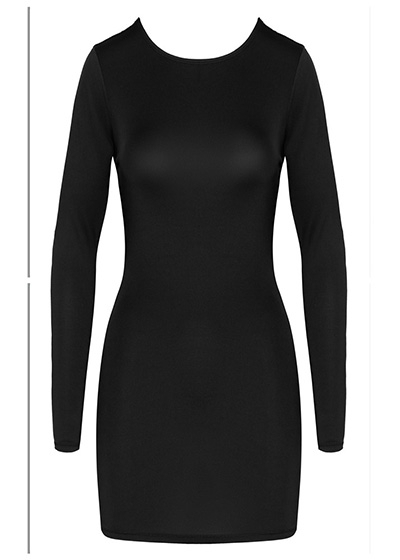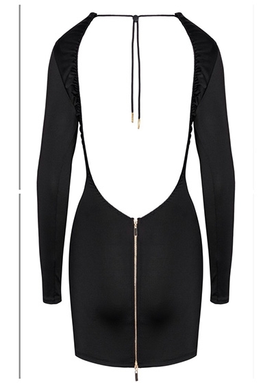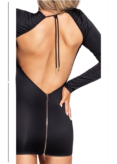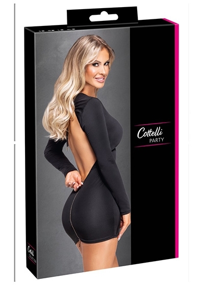 The black mini dress from Cottelli PARTY is tight-fitting and has long sleeves. It has a large breathtaking cut-out at the back and a cord at the back of the neck that can be adjusted. There is a gold-coloured, 2-way zip at the back of the skirt part. The delicate stretchy material clings softly to the body and is extremely comfortable to wear.