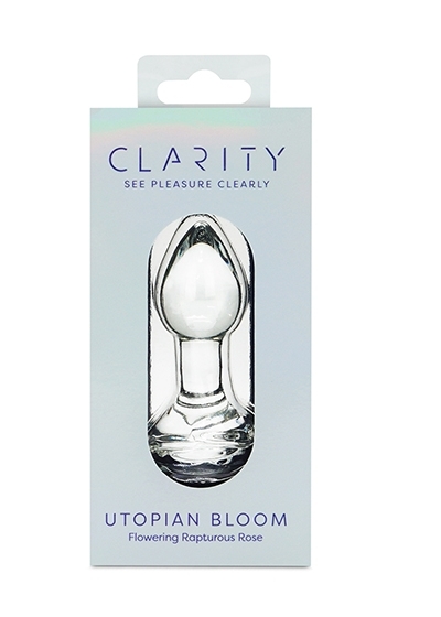 The Clarity Utopian Bloom is a 4.3-inch handcrafted glass butt plug that balances simplicity, elegance, and deeply satisfying control.