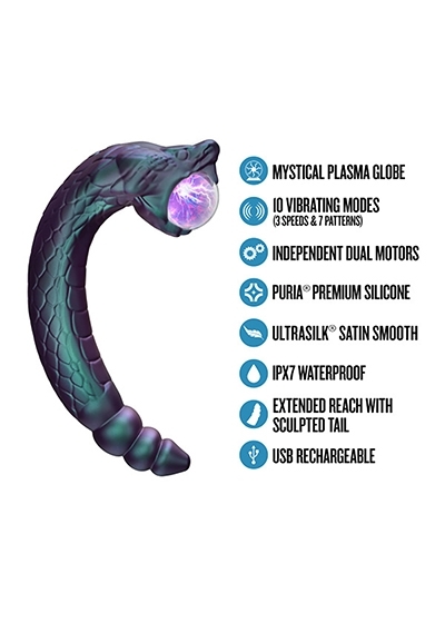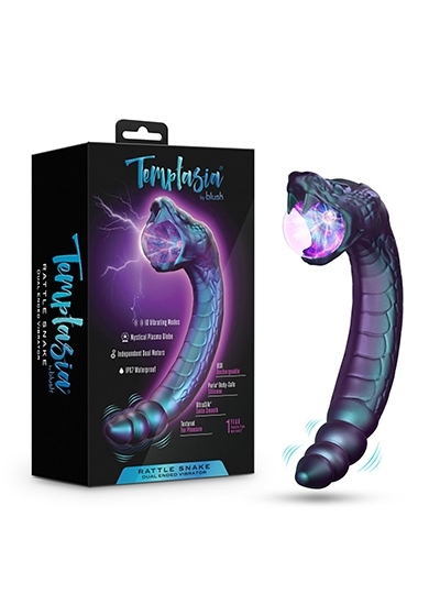 Surrender to your deepest desires with Temptasia’s Rattle Snake, a deviant pulse vibrator that strikes with electrifying intensity. Its glowing plasma globe crackles with energy, illuminating each movement as your excitement builds, while dual motors deliver 10 tantalizing vibration modes (3 speeds and 7 patterns) for customized pleasure. The Rattle Snake’s long, flexible body invites endless exploration—use the rounded head for deep internal bliss or let the sculpted, ridged tail trace your curves, teasing the G-spot, clitoris, and every sensitive contour along the way. Crafted from Puria® body-safe silicone and wrapped in UltraSilk® satin-smooth finish, it glides across the skin with effortless seduction. With waterproof and USB charging features, the Rattle Snake is always ready to entice, whether solo or with a partner. Bold, glowing, and irresistibly daring, it’s a serpent of temptation made to awaken your senses and lead you into waves of untamed ecstasy.