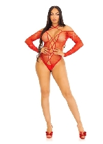 Seamless Net and Lace Lingerie Jumpsuit - With Keyhole Crossover Halter - Os - Black/Red